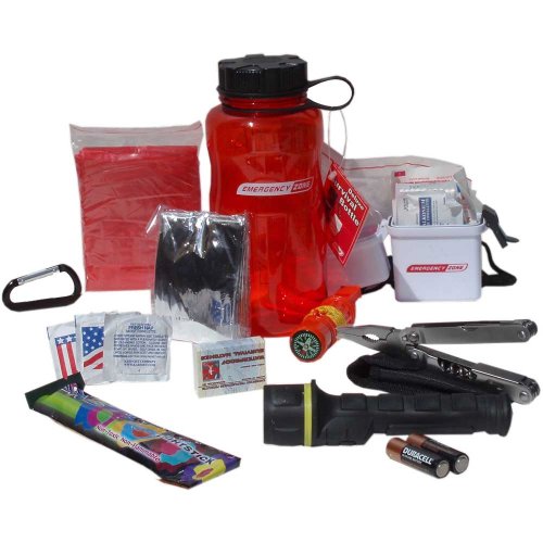 Emergency ZoneĀ® Brand. This kit includes the following: 1 Lexan bottle (1L), 1 flashlight with 2 AA batteries, 1 box of 50 waterproof matches, 1 light stick that lasts up to 8 hours, 1 5 in 1 survival whistle, 1 emergency blanket, 1 emergency poncho, 1 multi-tool pliers, 1 First Aid Kit (43 Pc), 1 waterproof document container, 1 carabiner and 1 gallon zip lock bag.
